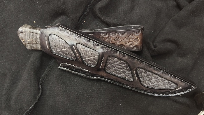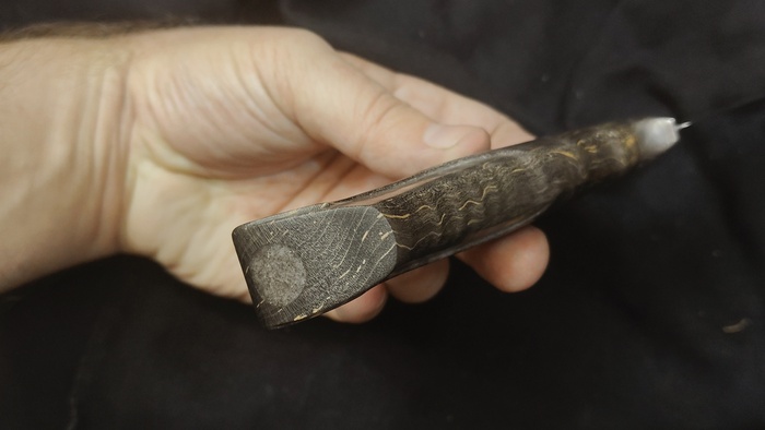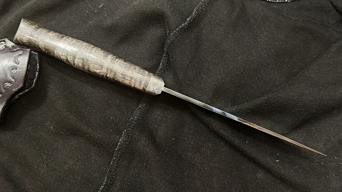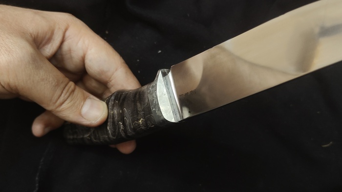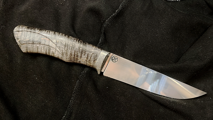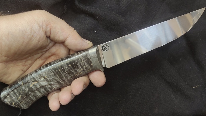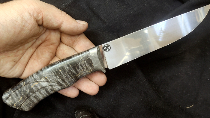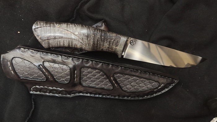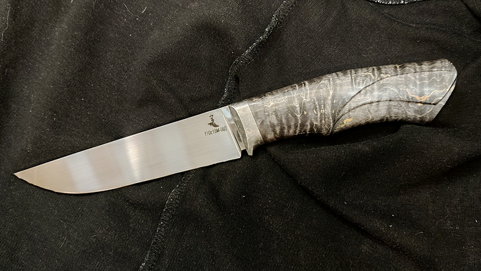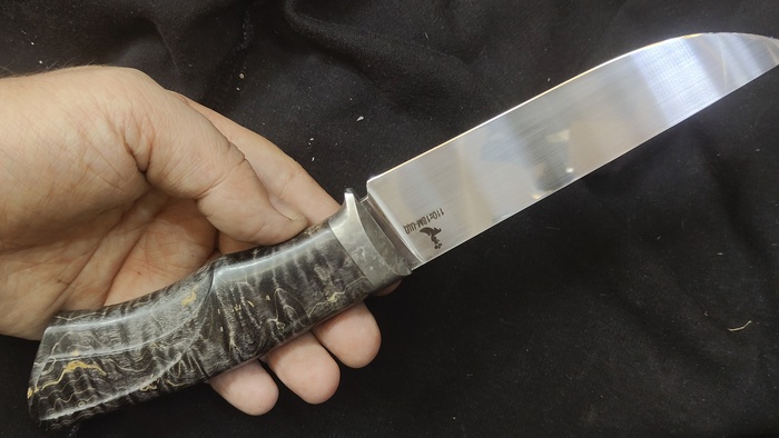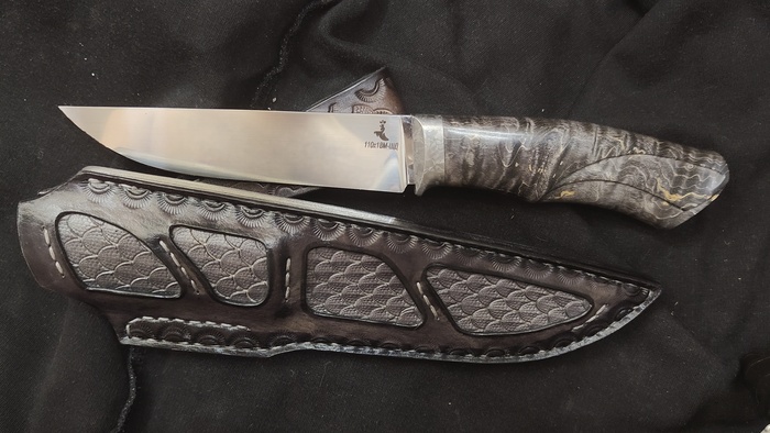 Клинок Н. Елезова 110х18МШД 135х32х3,6 мм на 61HRC. Сатин Р1500 по полировке. Клинок слегка переслесарен, убрал всю кованину. Больстер - кристализованный титан, рукоять - стабилизированный клен от С. Гринина. Монтаж сквозной на стяжку + эпокси-титан. Ножны растишка 4 мм, подвес свободный.