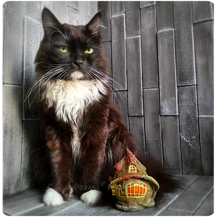 Самый маленький — Шародомик из папье-маше, с подвесом. Елочная игрушка или подвесной декор в сад — на ветку дерева или на кронштейн в цветник. Кот (для понимания масштаба) — мелкий, всего 3,7-3,8 кг., если что. Но моську солидную умеет скорчить — только в путь.) Высота домика — 9,5 см. Взвешивать лениво.)))