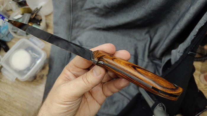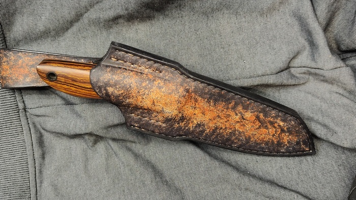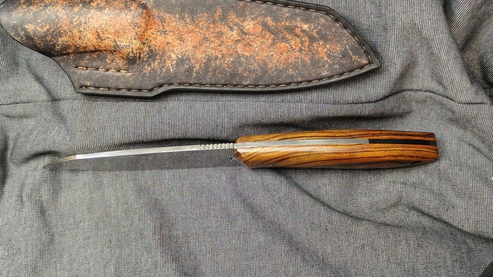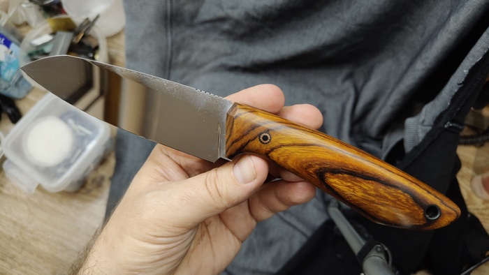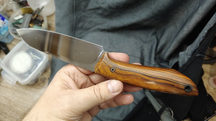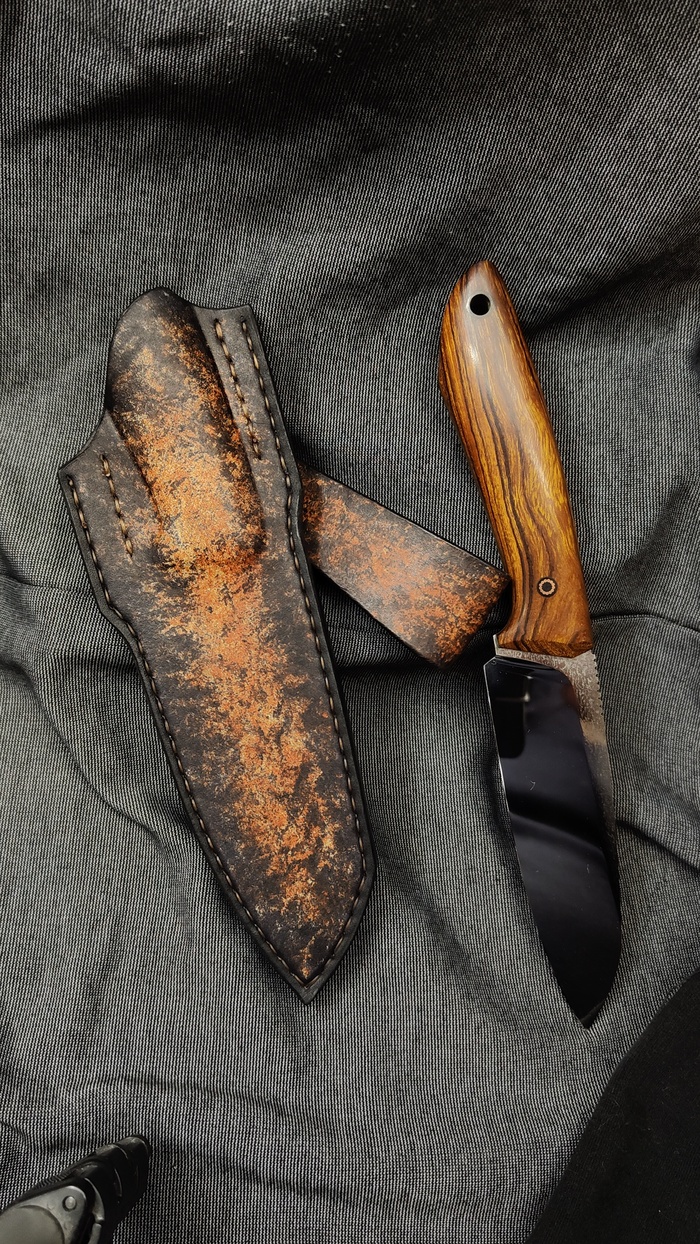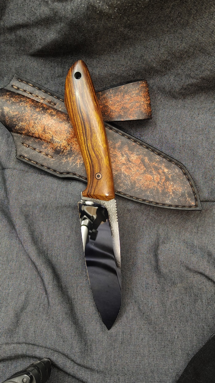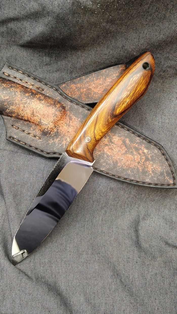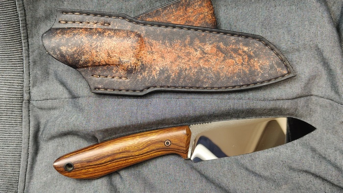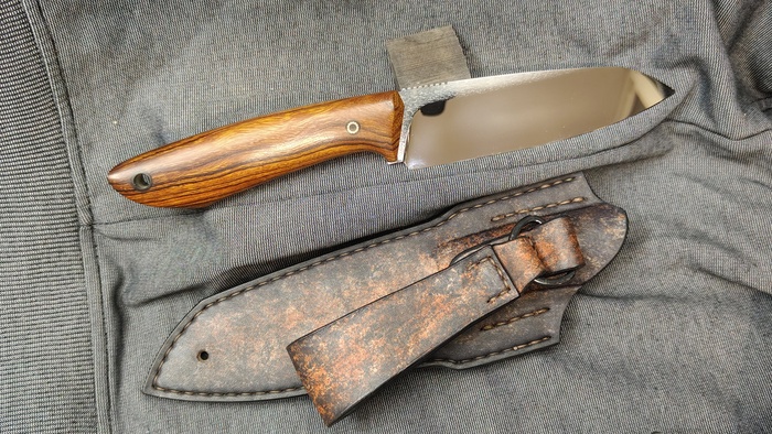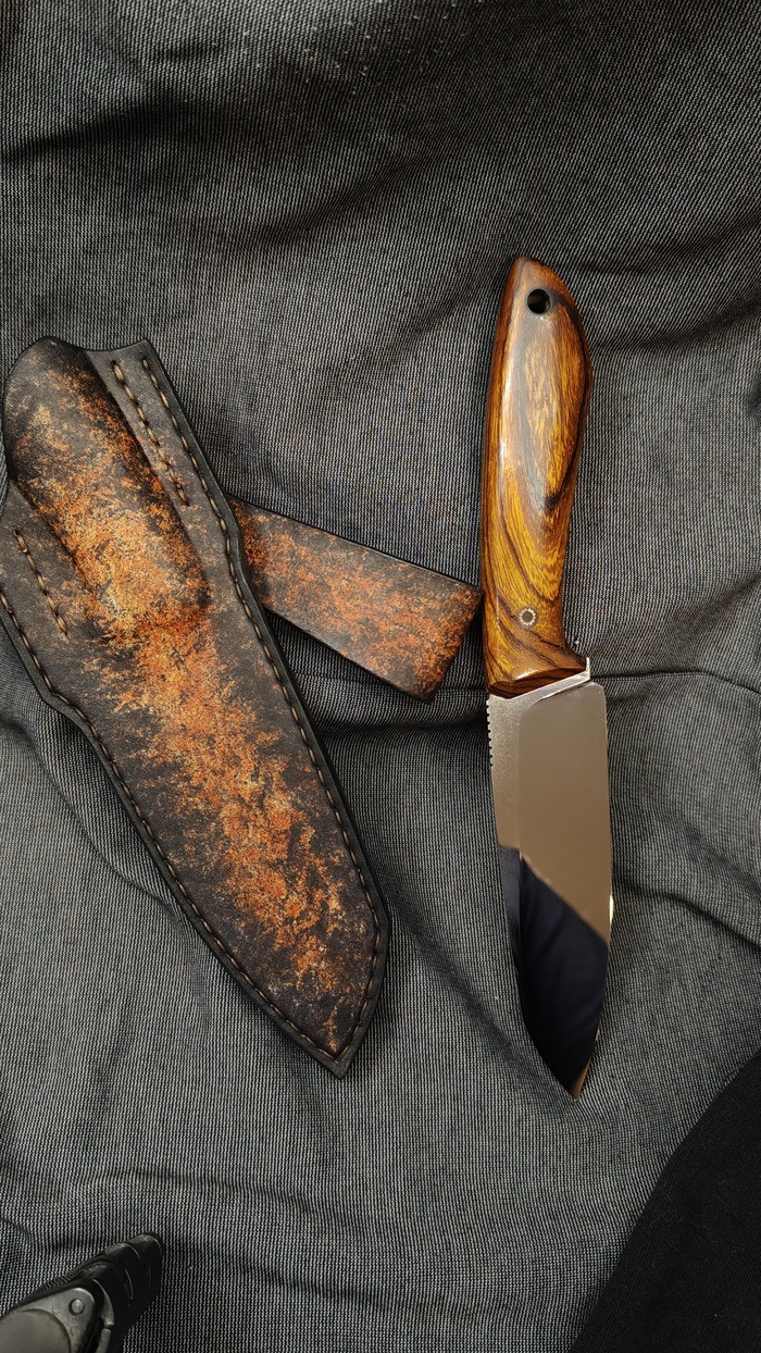 CPM-S90V, айронвуд, G10, кожа и снова некоторое количество нервов. 4 раза переполировать это прям кайф! Точится сложновато, пока начал снимать стружку с волос пришлось постараться. Из нового для себя - покраска ножен. Долго, неторопливо, но симпатично на мой взгляд.