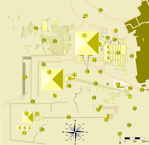 1. Пирамида Хеопса; 2. Пирамида Хефрена; 3. Пирамида Микерина; 4. Погребальный храм Хефрена; 5. Погребальный храм; 6. Пирамида спутник; 7. Храм Хефрена в долине; 8. Храм Микерина в долине; 9. Гробница царицы Хетеп-Херес I; 10. Пирамида Хенткаус I; 11. Пирамиды цариц; 12. Мастабы; 13. Большой сфинкс; 14. Храм сфинкса; 15. Гробница Хемиуну; 16. Центр изучения пирамид; 17. Билетная касса (шутка про предприимчивых древних египтян); 18. Ямы, в которых найдены Солнечные лодки; 19. Новая дорога; 20. Гробницы высеченные в скале; 21. Деревня ремесленников; 22. Каир; 23. Деревня Назлет-эль-Самман; 24. Погребальная дорога; 25. каменоломня Микерина; 26. Современное кладбище; 27. К югу, гробницы вырубленные в скальной породе; 28. Стена ограды; 29. Мастабы и гробницы вырубленные в скальной породе; 30. Западное кладбище; 31. Восточное кладбище; 32. Зона мастаб в центре и гробницы вырубленные в скале.