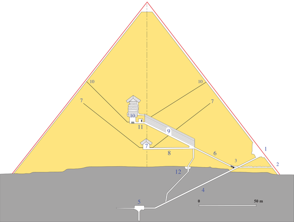 Поперечный разрез пирамиды Хеопса: 1. Главный вход 2. Вход, который проделал аль-Мамун 3. Перекрёсток, «пробка» и туннель аль-Мамуна, сделанный «в обход» 4. Нисходящий коридор 5. Незавершённая подземная камера 6. Восходящий коридор 7. «Камера царицы» с исходящими «воздуховодами» 8. Горизонтальный туннель 9. Большая галерея 10. Камера фараона с «воздуховодами» 11. Предкамера 12. Грот