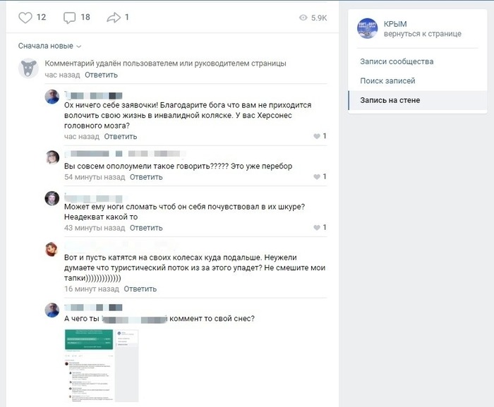 "Историческое наследие гораздо важнее туристов с ограниченными возможностями. Пусть посидят дома, а для нас это история!" - писал в паблике Крым один из пользователей. Однако, после возмущения других пользователей данный комментарий исчез, как и сама публикация, а сам он начал открещиваться от своих слов, утверждать что это фотошоп и пугать распространяющих скрин переписки обращениями в техподдержку Вконтакте.