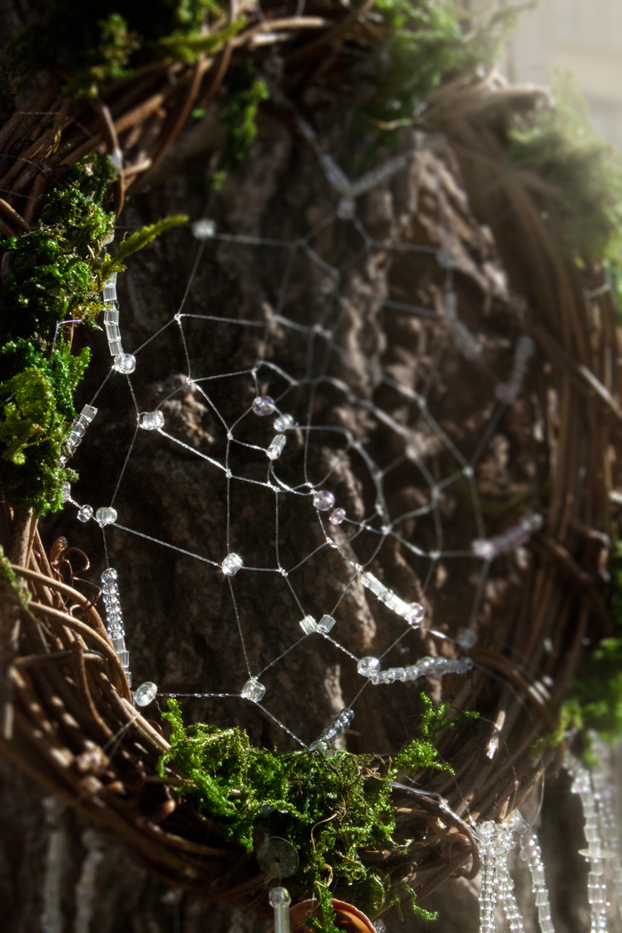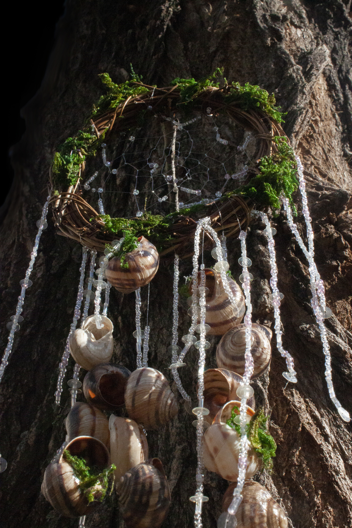 Задумка родилась, когда я гуляла в древнем городе Херсонес, я находила стооооько раковин от улиток, что захотелось их себе забрать и что-то смастерить. И в голове родилась композиция: ловец снов из веточек , внутри которого паутинка невидимая и капельки утренней росы 😍 ну а спускающиеся капли и ракушки это уже просто оформление, как и мох. Все это как в лесу, когда даже ракушки на мхе среди паутин смотрятся гармонично в глубине темного леса...