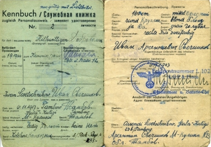 ОТВЕТ. В немецкой армии я получал довольствие наравне с немецкими солдатами, хлеба 700 гр., 200-150 гр. масла, кофей, колбасу, иногда мёд, это утром и вечером, а днём горячий обед из общей кухни с немцами. Кроме того за службу в немецкой армии нам платили денег 27,5 марки в месяц, на которые получали продукты дополнительно к пайку и другие необходимые вещи.