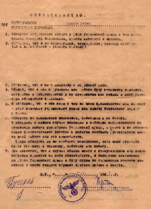 ОТВЕТ. Весь текст данного мною немцам обязательства я теперь по памяти не восстановлю, но помню, что в обязательстве было указано: «Я, русский военнопленный, вступая добровольно в немецкую армию, обязуюсь честно служить в немецкой армии и добросовестно выполнять все указания немецкого командования». Данное мной обязательство я, находясь в немецкой армии, честно выполнял...