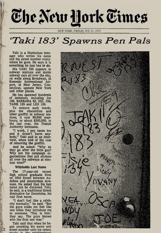 Среди основателей обычно вспоминают Taki 183 (укороченное от Dimitraki - греческое Деметриус), который первым достиг уровня All City (пометил весь город росписью "Здесь был Дима" в переводе на русский). Тэг (метка):