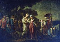 После смерти мужа Ольги древляне отправили к ней сватов, чтобы выдать ее замуж за их князя Мала. Сваты причалили к берегу в ладье, в которой их и схоронили живьем в земле. Ольга говорила послам: «Люба ми есть речь ваша, уже мне мужа своего не кресити [не воскресить]; но хочю вы почтити наутрия пред людьми своими, а ныне идете в лодью свою, и лязите в лодьи величающеся, и аз утро послю по вы, вы же рьцете [скажете]: не едем на конех, не пеши идем, но понесете ны в лодье; и взнесут вы в лодьи...» Это упоминается в Радзивилловской летописи, как и рисунок, приведенный ниже. Но эта летопись была создана на основе столь известной «Повести временных лет». Чисто теоретически, ситуация нормальная для того времени: племя убило мужа княгини и чтобы взять контроль над территорией предлагает княгине защиту в виде нового мужа. Иметь фактически заложником ребенка, который будет следующим князем, тоже нормально. То, что княгиня, которая была язычницей и действовала из соображений мести, в принципе, возможно.