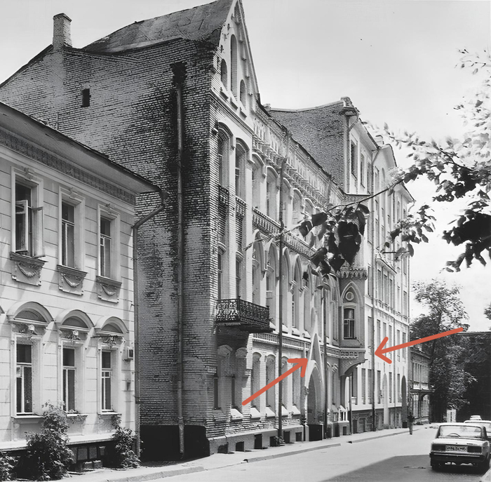 А кто создатель этой цыпочки? А это арх.бюро "Остоженка" в 2005 во время реставрации ее туда внедрило, вот шпионит теперь. И еще единорога над входом - с веточкой маслины то ли в роте, то ли прям во рту. Ну и ладно, неисторично, зато весело. (На черно-белом фото доказательство инородности зверья, а на цветном кадре из Покровских ворот - вы только посмотрите! - какие оконные рамы во дворе. Объеденье.)