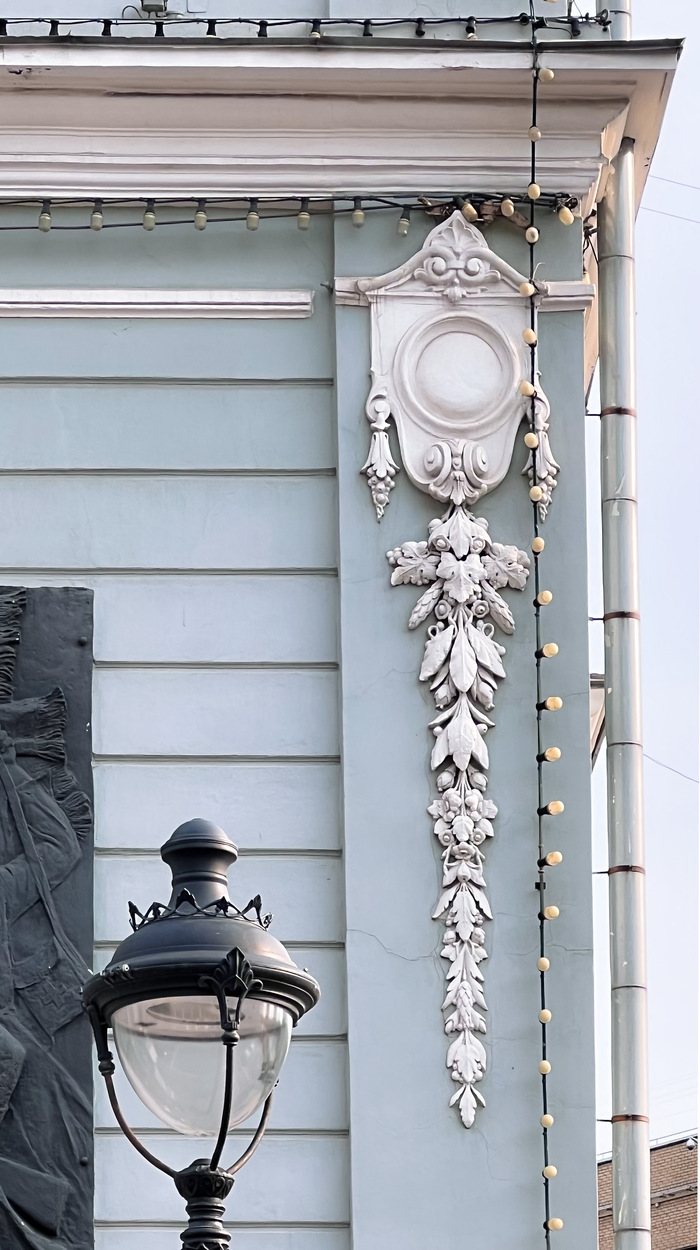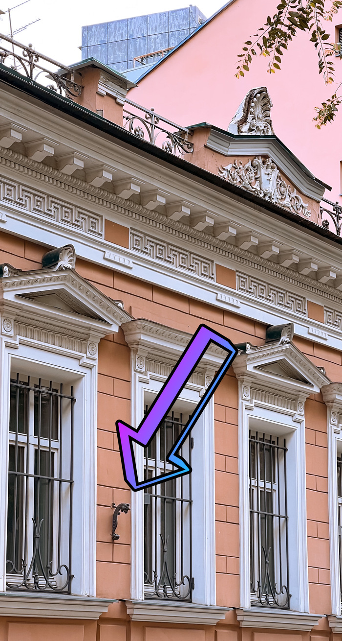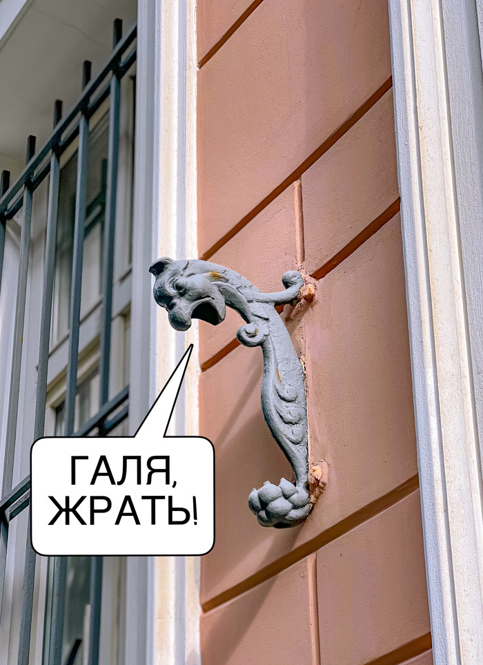 Однако народная память, напрочь игнорируя слона в комнате, запечатлела в словах всего-то две маленькие моськи. Где? Воооон там, включите зум: малюсенький гибрид попугая, морского конька и шишки висит на фасаде между окон. В двух экземплярах, как и грифоны. Зачем они нужны? Я не знаю, видимо, для радости.