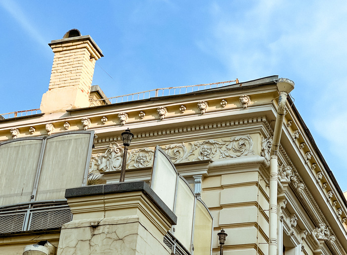 И одна химера у меня для вас есть: ее знают все - она сидит, подозрительно непарная, на скате особняка в Малом Кисловском переулке. В Москве есть ещё химеры, но они (как и положено в неоклассике) либо по две, либо по центру. В отличие от Нотр-дамских, наша химера не плачет - она стойкая баба, в неё не вмонтирован ливнесток.