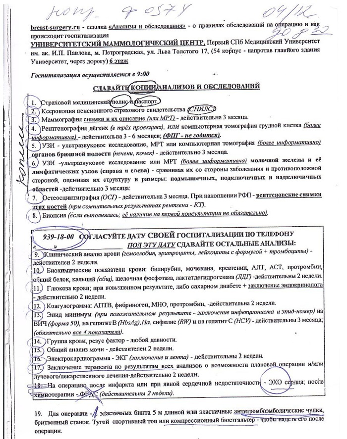 На приеме нам была выдана бумажка из 19 необходимых анализов и обследований (все это было платно и большинство обследований делалось в Песочке) и дано минимум информации, что делать дальше, также Коларькова В. В. сказала писать на мессенджеры, если что то будет непонятно.
