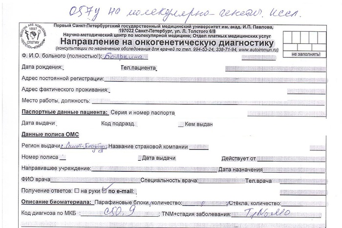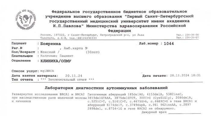 Когда встал вопрос о генетическом анализе на мутации генов BRCA1/BRCA2, от результатов которых зависело удалят ли обе груди или же есть шанс сохранить молочную железу, было не ясно каким методом его сдавать расширенным NGS или ПЦР. Об этом ничего врачом сказано изначально не было, узнали случайно, когда пытались записаться на данный анализ. Чтобы было понятно расширенный стоил на тот момент 30 тыс., а о том, что его готовность занимает целый месяц, я узнала уже когда сдала его, а ПЦР около 3 тыс и его готовность занимает около 2-х недель. Как позже выяснилось нужно начинать с ПЦР и только если придет положительный результат, тогда желательно сделать и расширенный анализ на мутации генов. Так как внятного ответа от врача я так и не получила, решила, что нужен расширенный метод, результаты которого сильно задержали и я ждала не положенный месяц, а все 5 недель, а т.к. операция планировалась на 4 декабря, мне пришлось срочно сдавать ПЦР, чтобы успеть получить результаты до операции, но и его результаты прилично задержали. А когда я звонила в этот первый мед, чтобы узнать о готовности ибо вышли уже все сроки, работники умудрялись и в этом случае хамить и дерзить.