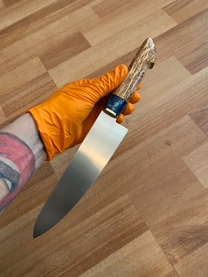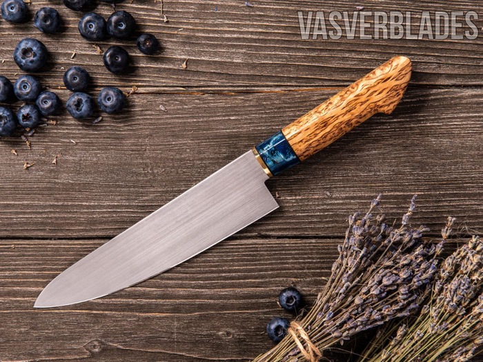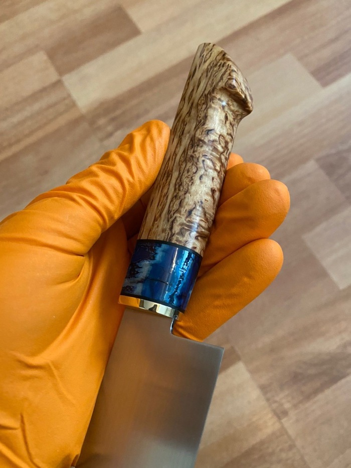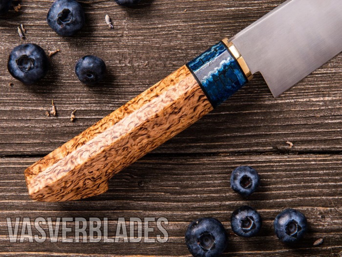 Рукоять: стабилизированная карельская берёза, стабилизированный зуб мамонта (синий), толстая латунь. Клинок: Vanax37, лучшая сталь, что у меня есть на кухонный нож. Заточил так, что крылья мухи на лету срежет.
