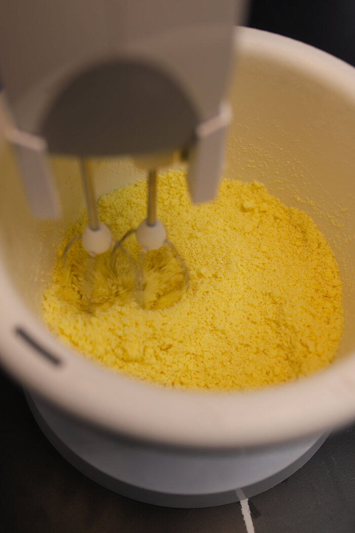 1. В чаше миксера смешайте соль, муку и сахар. Добавьте сливочное масло мелкими кусочками и взбивайте миксером до состояния крошки.