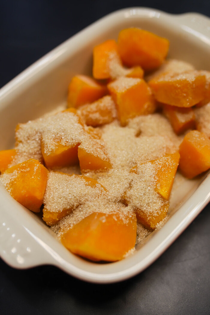 4. Положите порезанную кусачками тыкву в противень, смешайте сахар и специи и посыпьте ими тыкву. Запекайте в духовке 20-40 минут при 200 градусах до готовности.