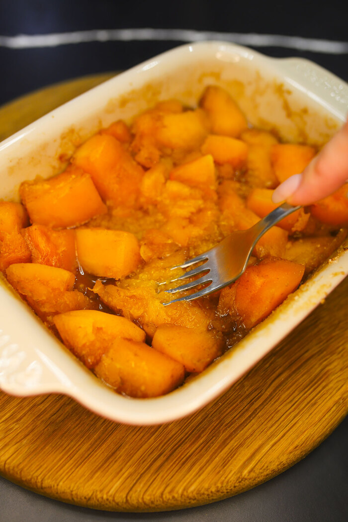 5. Когда тыква полностью размягчится, помните ее вилочкой до состояния пюре. Тщательно перемешайте.