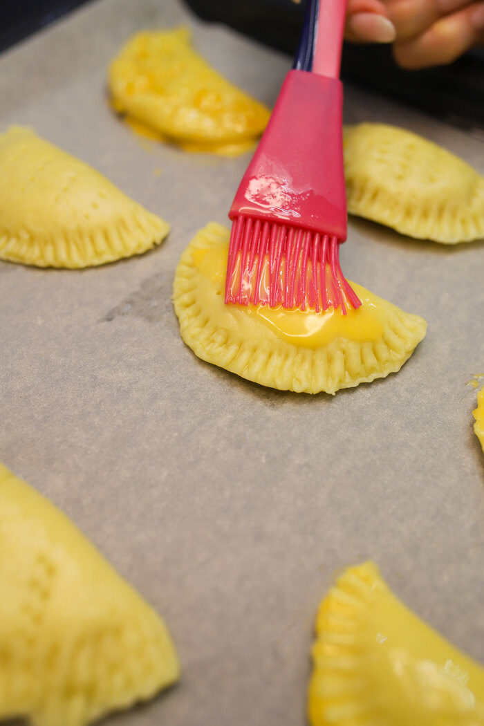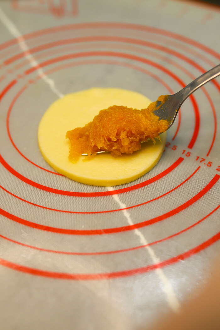 7. Сбоку от центра круга положите 1-2 чайных ложки начинки из тыквы, сверните тесто и закрепите по краю вилкой, создавая узор. Проколите пирожки вилкой.
