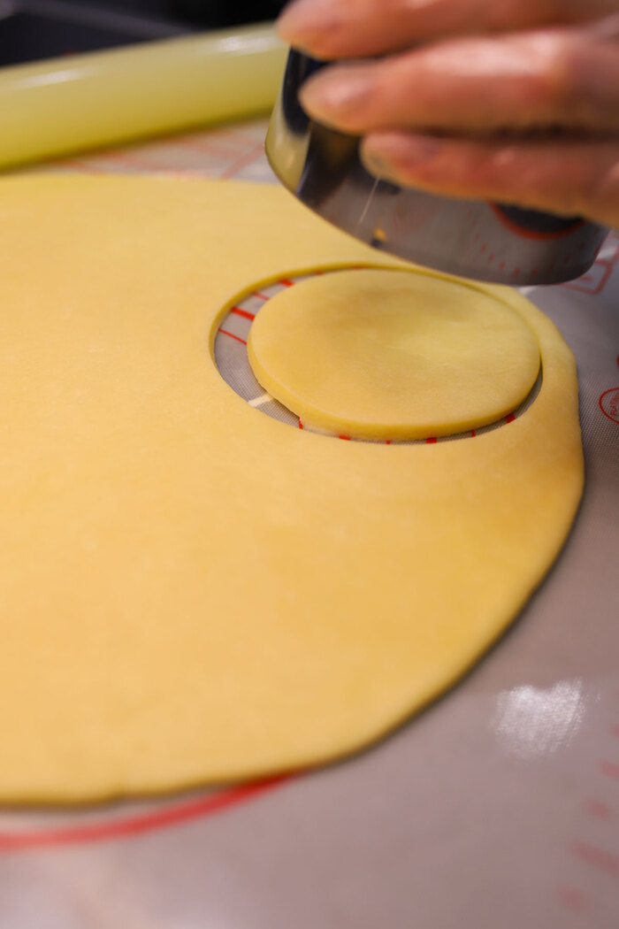 6. Достаньте тесто и раскатайте толщиной 0,5 см. Вырежьте из полученного теста круги. Можно воспользоваться стаканом или формой диаметром 8-10 см.