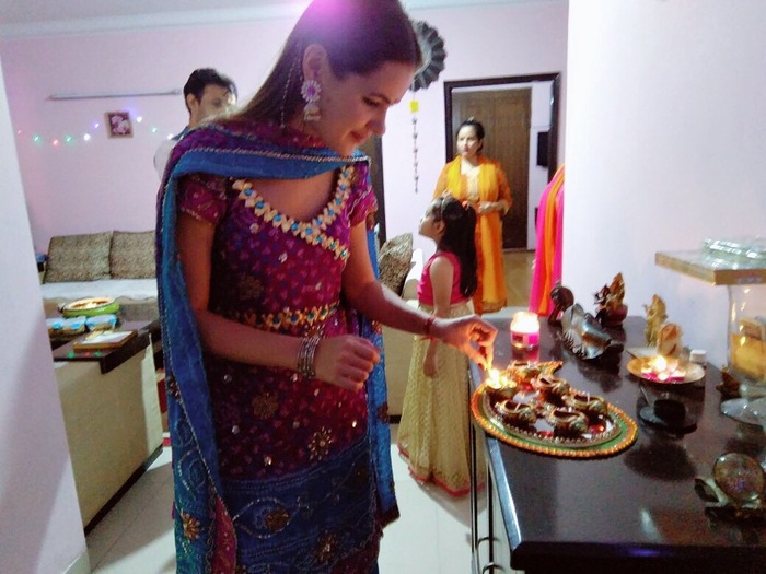 Вскоре после Навратри наступает самый главный индуистский праздник, он же индийский Новый год - праздник Дивали, фестиваль света. Дивали это самое главное событие года, предприятия выдают большой «Дивали бонус» деньгами (простым смертным тоже надо выдать бонус для прислуги), а некоторые бизнесмены дарят своим сотрудникам машины и квартиры, как г-н Савджи Дхолакия - 1260 машин и 400 квартир для работников своей компании!). Дивали - семейный праздник, на который все дарят друг другу большие подарки, а также сладости и орехи в просто огромных количествах. Так как это фестиваль света, то дома украшают гирляндами, свечами и специальными масляными свечами diya, также читают молитвы и проводят обряды для привлечения в дом богини благополучия Лакшми (после молитв двери оставляют открытыми, чтобы она могла войти в дом). В этом году я отмечала Дивали в индийской семье, и это было очень необычно! Особенно мне понравилось зажигать свечи, мы зажгли около ста маленьких свечей по всей квартире! Вот фото, поджигаю те самые масляные свечи: