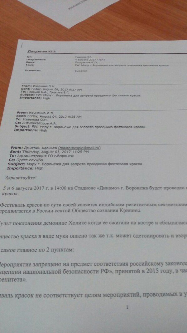 P.S. в летний период времени в одном городе может проходить и по 2-3 фестиваля красок в один день, без праздника в Воронеже никто не остался. И если в этом году все организаторы colorfest решили "и так пойдёт", не заключая договоренностей и не заморачиваясь с организационными моментами- тогда не надо ныть что ничего не выходит. ПРежде чем заниматься подобным финансовозатратным предприятием, изучите порядок подготовительных мероприятий. А пост писать, однобоко описывающий ситуацию, с попыткой притянуть за уши православных активистов, так себе занятие. Лучше пусть организаторы готовятся и заручаются поддержкой местных властей, а не притворяются зажатыми дядьками в черных рясах.