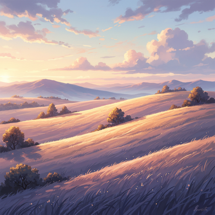 Промт: Anime-style rolling hills bathed in soft evening light. Gentle slopes glow in warm golden and peach tones, with long shadows stretching across the grass. The wind moves through the hills in slow waves, shifting the light across the landscape. Distant ridges fade into soft haze under a calm sky filled with pastel clouds. Small trees and shrubs dot the terrain, softly lit by the fading sun. The atmosphere feels warm, peaceful, and expansive, filled with quiet motion and serene evening calm.