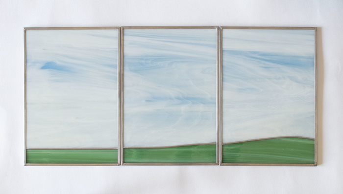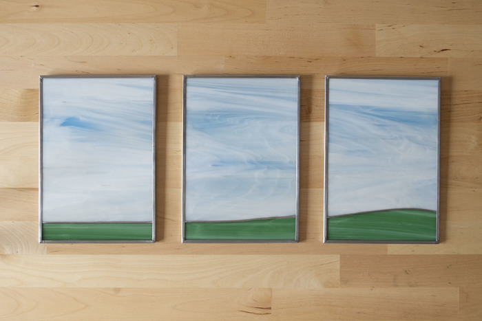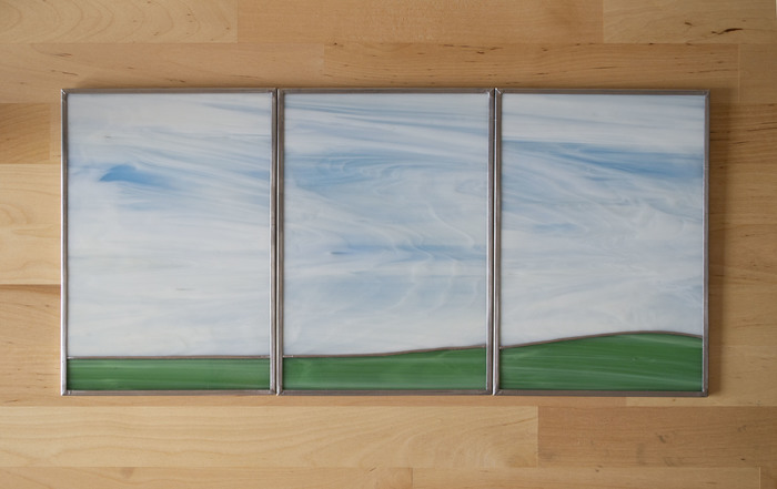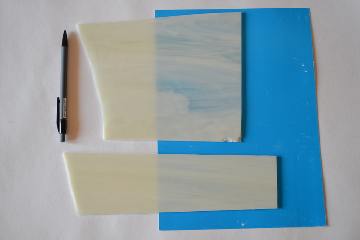 На складе поставщика витражного стекла выбирается лист опалового/опалесцентного стекла подходящего цвета/тона/прозрачности, рисунка. Такое стекло само по себе произведение искусства, каждый лист единственный в своем роде, разводы перья, прозрачности, неравномерности, все это готовая палитра.