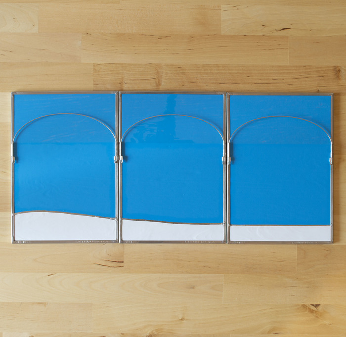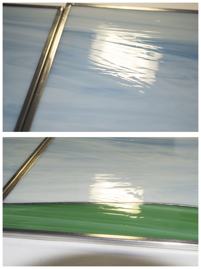 Спаиваются фрагменты стекла, припаивается рамка из луженого профиля, крепления. Наклеивается фон.