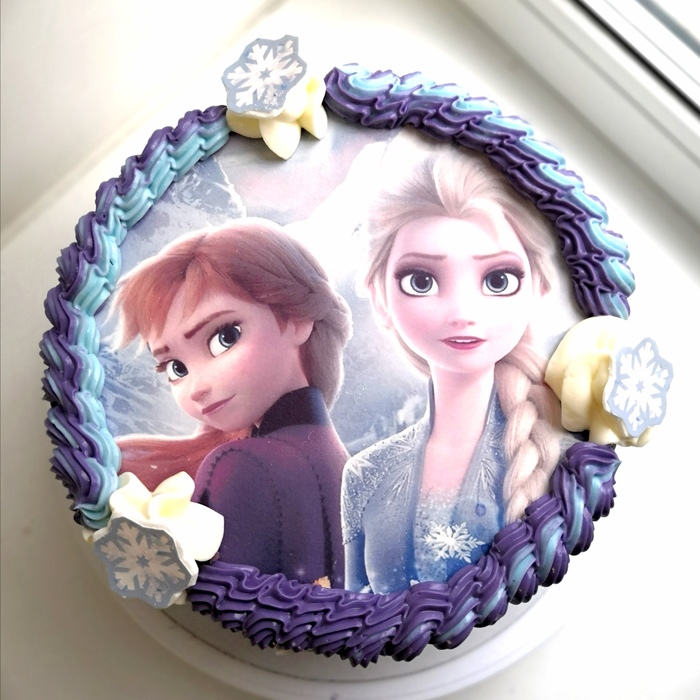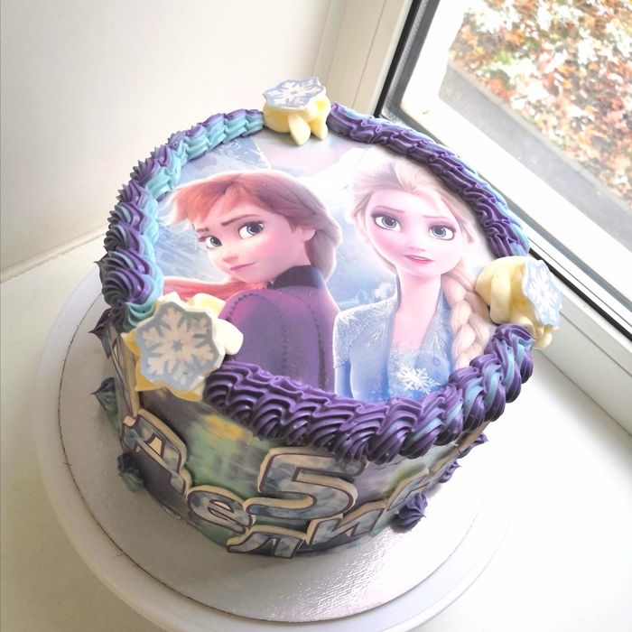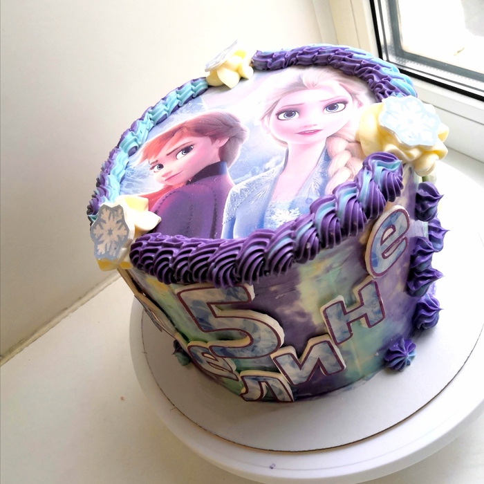 Выравнивала крем-чизом, декор из съедобной печати с подложкой из мастики. Девочке тортик понравился родители благодарили, а для меня это лучшая награда!