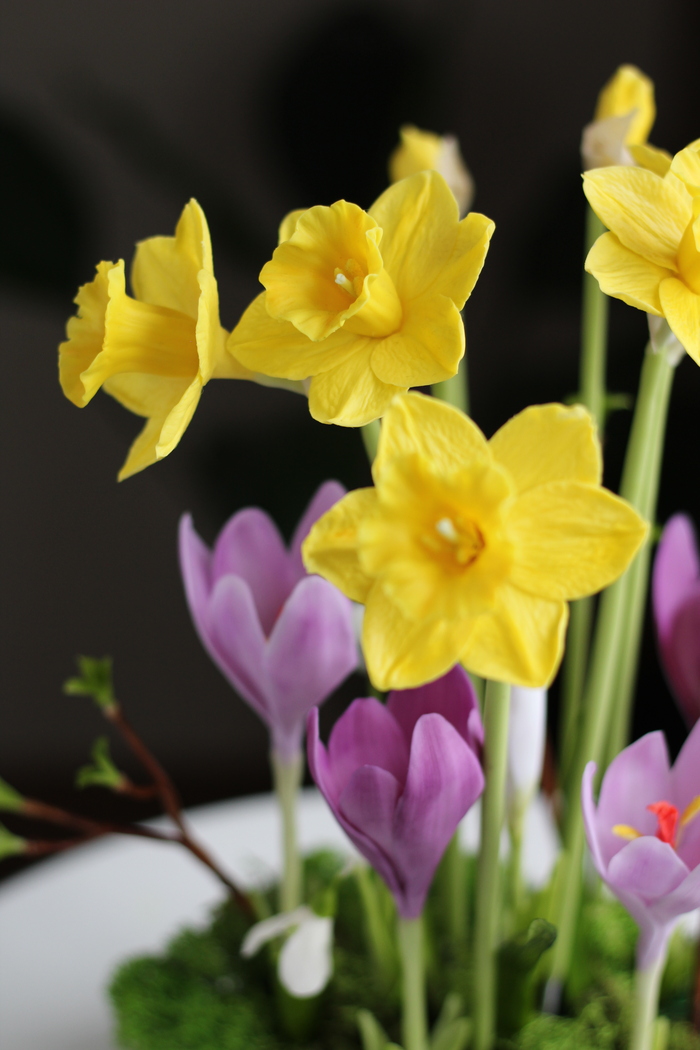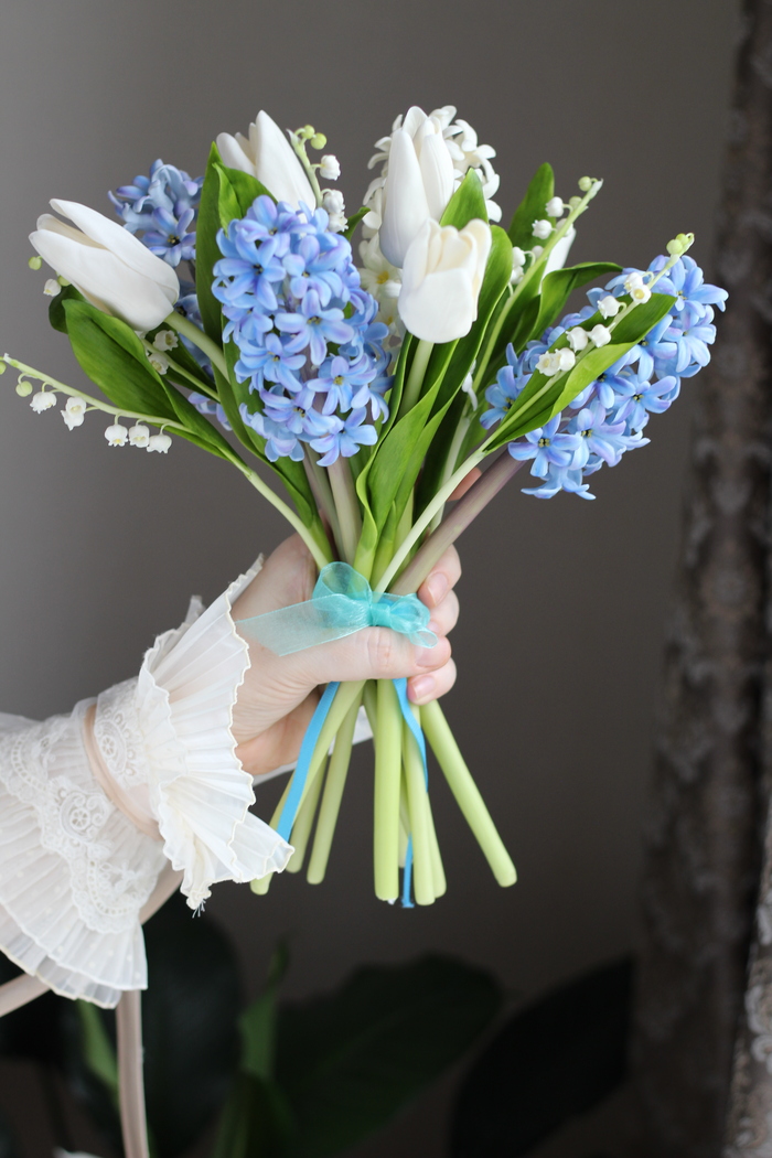 Отсутствие снега и температура выше нуля еще больше подталкивает меня на создание весенних работ. Вот такой букет из гиацинтов и тюльпанов у меня получился.