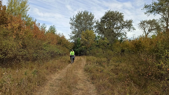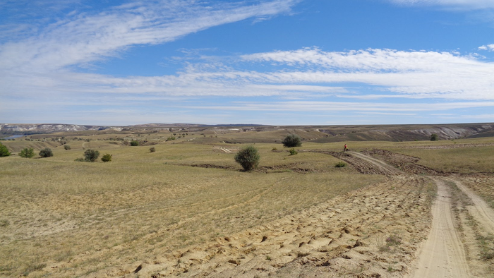 После Сиротинской, как говорил один мой знакомый велосипедист, "вид из окна велосипеда" кардинально меняется. Начинается рельеф. Овраги, балки, холмы, но дороги хорошие, накатистые, лишь в паре мест градиент оказывается для нас слишком большим и приходится топать пешком. Песок местами есть, но его не так много. В целом, местность чем-то напоминает картинки выжженных солнцем саванн какой-нибудь Намибии, не хватает только рогатых антилоп, зебр и прочих жирафов.