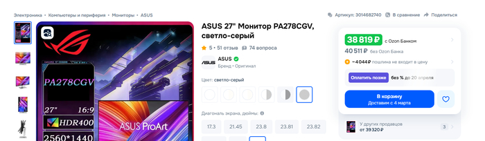 Полная оплата товара была произведена мною в день покупки.