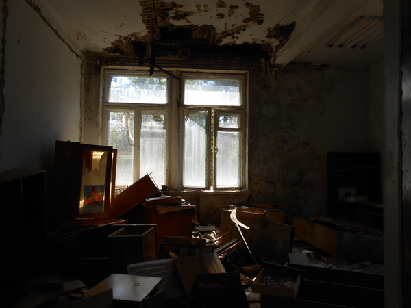 Кроме разворовки мелких вещей , сняли и вытащили все провода, прямо из стен. Вандалы по растаскивали остатки мебели по зданию , даже стекловату из старых дверей выковыряли.