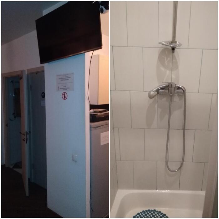 То в Бокстеле душевые комнаты предельно компактны, сам душ оборудован лишь поддоном и отделен занавеской, и даже некуда толком положить какие-то вещи, вроде сумки или пакета с мыльно-рыльными принадлежностями.