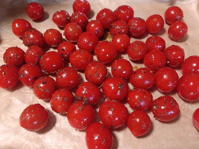 Смешайте томаты, оливковое масло и все специи в миске. Переложите в форму для запекания или на противень. Запекайте при температуре 220°C в течение 35 минут, пока помидоры не лопнут. Выньте из духовки, добавьте мелко нарезанный чеснок и перемешать.