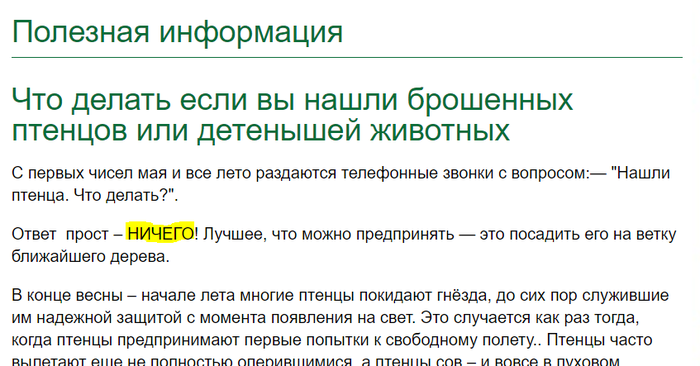 Самый ужас ситуации в том, что за пять дней, что птицы были у него, парень не обратился ни к ветеринару, ни к орнитологу. А зачем? Зато спас, молодец, герой. Теперь, посмотрев его видео, школьники рванутся спасать и выкармливать птенцов и зверят, просто потому что веселый дядька в Интернете так сделал. К слову, верхний коммент он поправил только после того, как под видео (https://youtu.be/0FsJi-1Colg) набежала возмущенная общественность. А она бы не набежала, если бы люди не начали спрашивать у орнитологов, "А что, так можно было?" И вот ответ (https://youtu.be/kJFxMdARbE4) орнитолога Ники Зубры, которая четко дает понять: так делать нельзя. Ну нельзя.