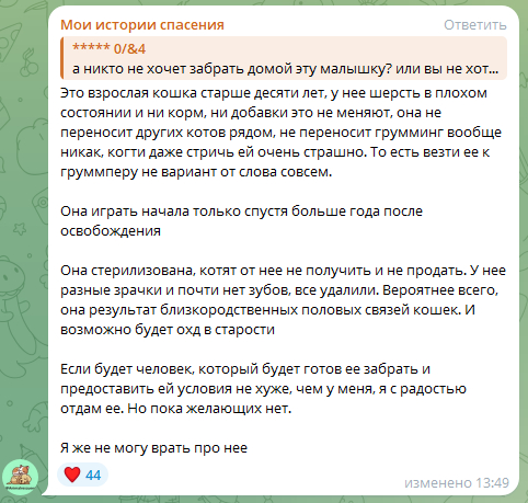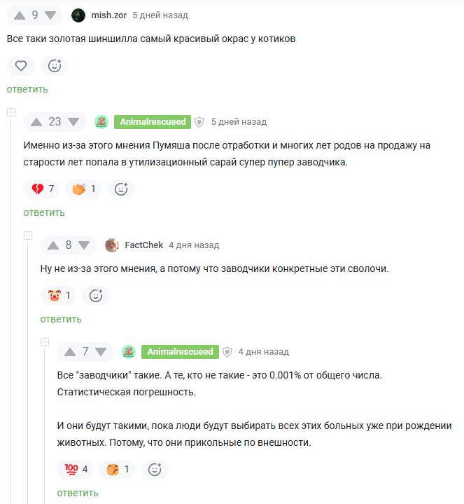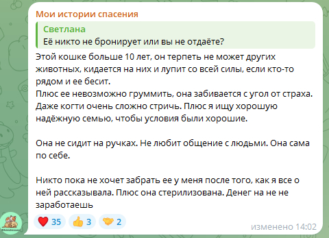 В этом сообщении половина - полная чушь. Золотых шиншилл действительно нельзя отнести к тем кошкам, которые "залюбят насмерть": они ненавязчивы, не лезут к хозяевам "на ручки" и естественно не возлюбят "грумминг", потому что это весьма неприятная, а то и болезненная процедура (хотя конечно смотря кто и как ее проводит). Мифу про "много лет родов на продажу" у меня посвящена целая статья. Также среди любых кошек встречаются лидеры и аутсайдеры: те и другие не чувствуют себя комфортно в кошачьем прайде и должны жить отдельно, а не в условиях переполненного приюта. Но если представить характер этой кошки так, как это делает Animalrescueed, понятно, что никакая "хорошая надежная семья" не захочет взять себе такую плохую, агрессивную кошку, которая "кидается и лупит со всей силы".
