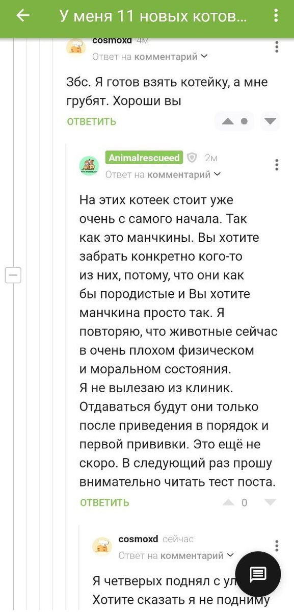 Аналогичным образом Animalrescueed "пристраивает" и попавших ей в руки кошек-манчкинов. Желающим взять себе такую интересную кошку она не просто отказывала, а отказывала в грубой форме: