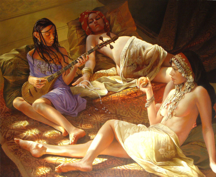 Отвез её император к себе и взял в жены, и поселил в летнем дворце, в садах которого фонтаны покрывают росою цветы, где у позолоченных колонн деревья гнутся под тяжестью плодов. И там, среди цветов и солнечных лучей жила прекрасная молодая императрица, и император её так любил, что с ней позабыл обо всём на свете.