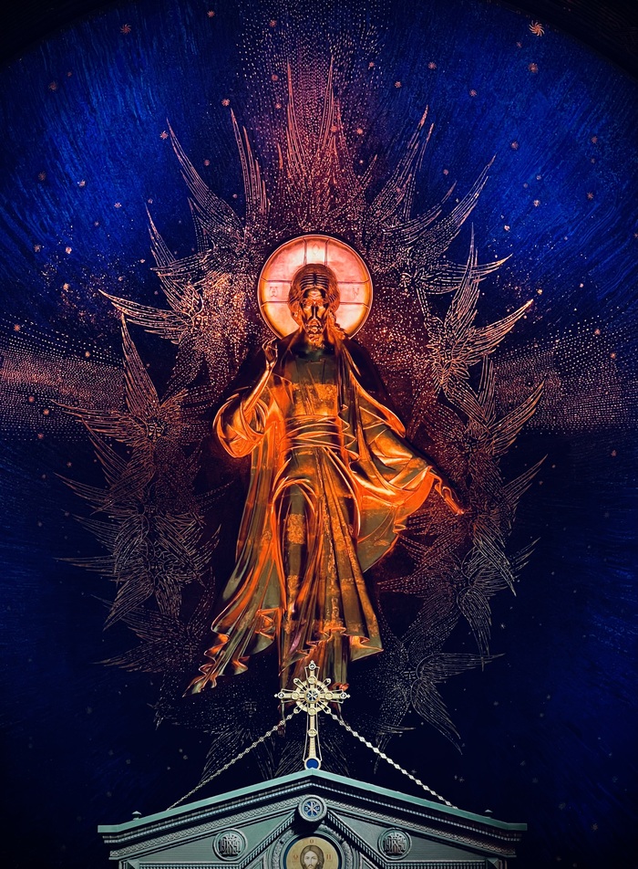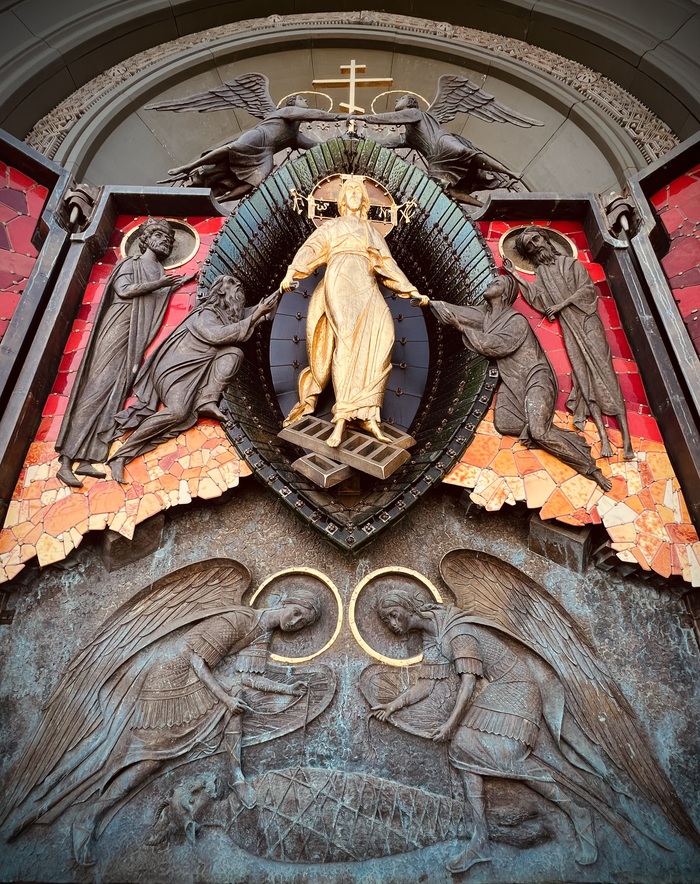 Ниже уникальная икона-складень Воскресения Христова. Он выполнен с применением золочения, эмалей и полудрагоценных камней. Складень в будние дни закрыт и открывается в субботу в 17 часов. Открытые створки как на снимке можно увидеть только в выходные дни
