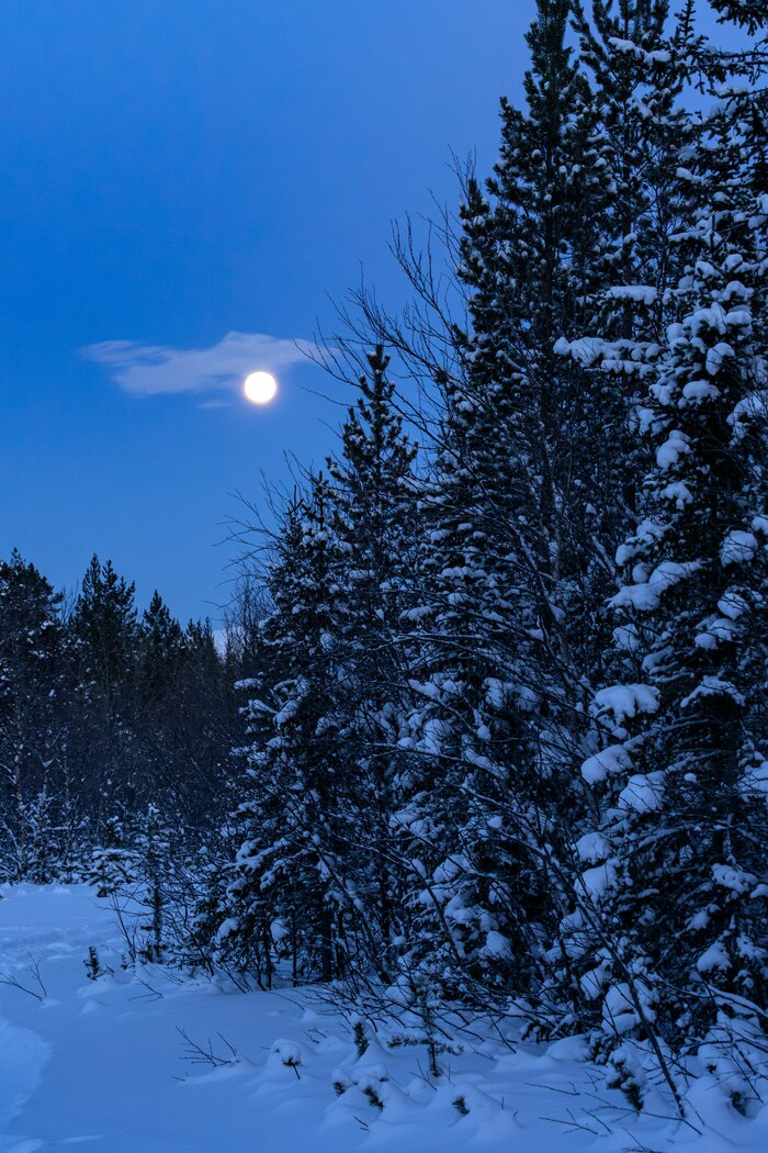 довелось побывать в Хибинах. Повезло с погодой, успел сделать несколько снимков с полной луной. В начале января ещё идёт полярная ночь, хотя солнечные лучи немного пробиваются из-за горизонта. Не повезло только с полярным сиянием. Оно было один раз, как вспышка, даже не успел настроить технику.