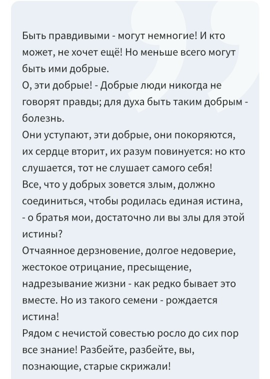 Ницше — объясняет, почему «добрые» не могут быть правдивыми и потому служат злу.