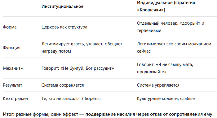 То есть христианское непротивление в публичном поле (особенно если христианин имеет авторитет или статус жертвы) легитимирует зло ровно тем же механизмом, что и молчание сотрудницы.