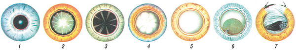 Формы катаракты. 1. Передняя полярная катаракта: в центре зрачка видно ограниченное помутнение серого цвета. 2. Слоистая (зонулярная) катаракта: в центре расширенного зрачка дисковидное помутнение хрусталика. 3. Начальная возрастная катаракта: помутнения в виде стрел, идущих от экваториальной области к центру. 4. Незрелая возрастная катаракта: частичное помутнение хрусталика. 5. Зрелая возрастная катаракта: помутнение всех слоёв хрусталика. 6. Морганиева катаракта: опущение ядра хрусталика вниз (указано стрелкой). 7. Вторичная катаракта: в области зрачка видна плотная плёнка с просветом в центре; границы дефекта радужки указаны стрелками. Источник: Большая медицинская энциклопедия, Главный редактор Б. В. Петровский издание третье, онлайн версия