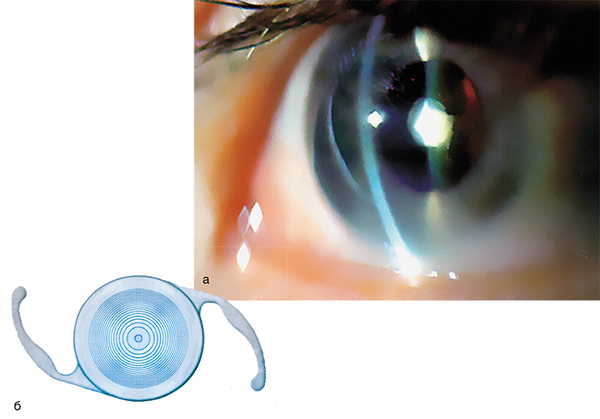 Рис. а – глаз, пораженный передней прямой катарактой; Рис. б – бифокальная интраокулярная линза, разработанная в Институте автоматики и электрометрии СО РАН (Новосибирск)