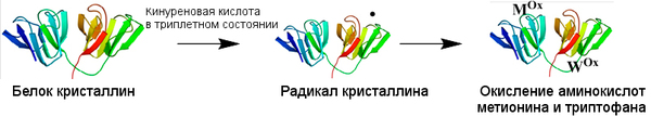 Молекула, поглотившая квант света, может переходить в реакционное триплетное состояние, вступать в реакцию с белками хрусталика и «отбирать» электрон у какой-либо аминокислоты, то есть, окислять ее. Мᴼˣ – окисленный метионин, Wᴼˣ – окисленный триптофан)