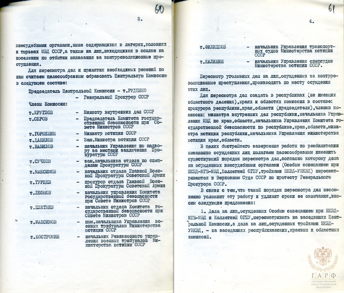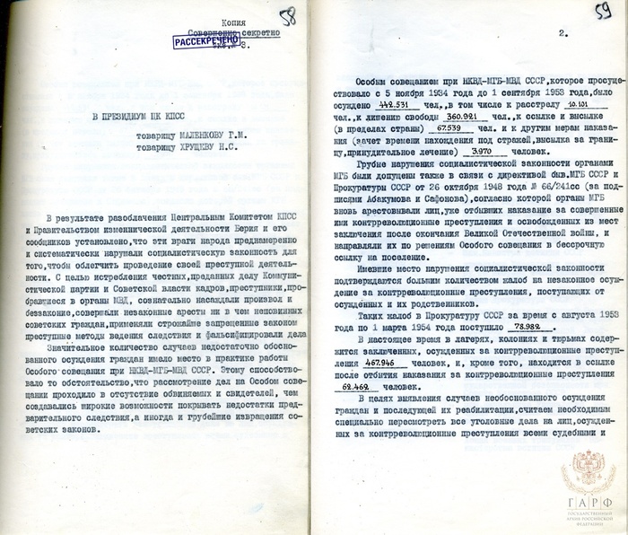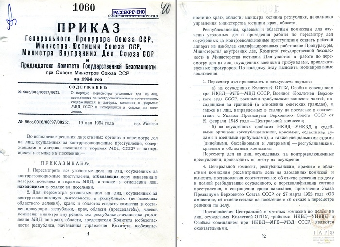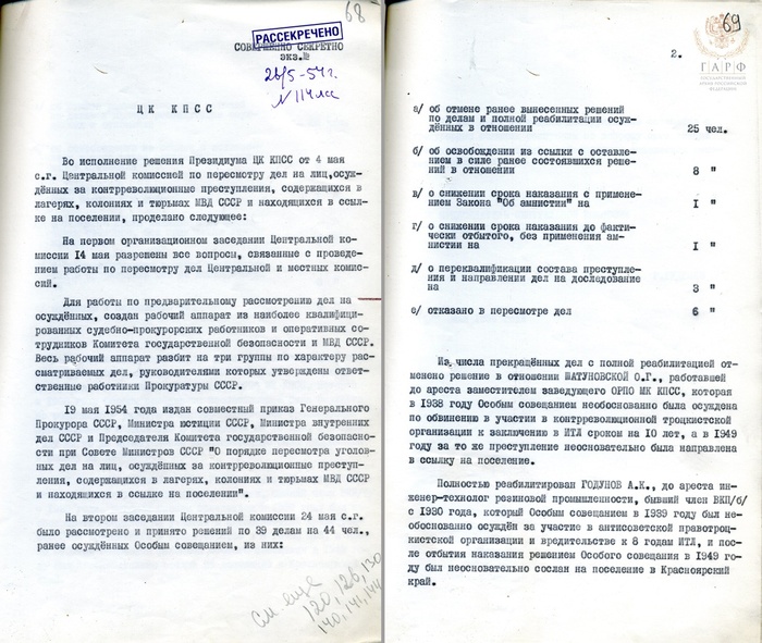 Несмотря на гигантскую работу, проведенную комиссиями, ее результаты удручают: число реабилитированных оказалось каплей в море, и почти половина политических заключенных Главного управления исправительно-трудовых лагерей (Гулаг) была признана осужденной правильно. Дальнейшие шаги по реабилитации должны были развиваться по иным схемам. Решение проблемы прозвучало в докладе Н.С. Хрущева на ХХ съезде КПСС. Развенчав культ личности И.В. Сталина, советские руководители в какой-то мере признали особые, политические причины репрессий. После съезда пошла вторая волна массового пересмотра дел – реабилитации и освобождения заключенных из лагерей, давшая более ощутимый результат.Документы о деятельности Центральной и местных комиссий представлены в Государственном архиве Российской Федерации (ГА РФ) фрагментарно. В фонде Прокуратуры СССР (Ф. Р-8131. Оп. 32) отложились копии постановочных записок Прокуратуры СССР, МВД и КГБ при Совете Министров СССР в ЦК КПСС о создании комиссий по пересмотру дел; копии отчетов в ЦК КПСС о работе Центральной комиссии, а также статистические справки Учетно-архивного отдела КГБ при Совете министров СССР о работе как Центральной, так и местных комиссий. Документов местных комиссий в фонде Прокуратуры СССР сохранилось немного. В основном это переписка с Прокуратурой СССР по организационным вопросам, сообщения прокуроров отдельных республик, краев и областей о работе комиссий, справки о неправильном разрешении дел в республиканских и областных комиссиях. Аналогичные материалы – справки, переписка, отчеты – хранятся в фонде Прокуратуры РСФСР (Ф. А-461. Оп. 8). Что касается материалов о работе комиссий союзных республик, то они, по всей видимости, хранятся в центральных архивах соответствующих государств. Заключения комиссий по конкретным делам встречаются в делах надзорного производства Прокуратуры СССР и Прокуратуры РСФСР (Ф. Р-8131. Оп. 31, 36; Ф. А-461. Оп. 1–4, 9).