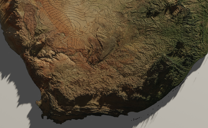 На самом деле я все время пытаюсь как-то улучшить карты, и на этот раз я попробовал вместо изменения самой модели (через displacement) наложить карту нормалей. Первым методом я максимум получал модель с 16 млн точек, а здесь их более 500 млн. Поэтому мы получаем намного более высокое разрешение и детальность карты.