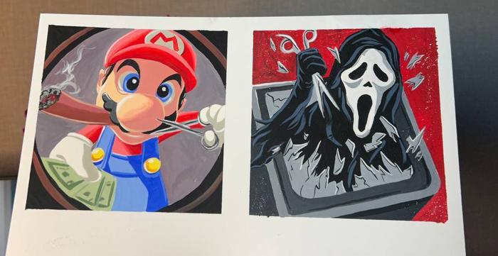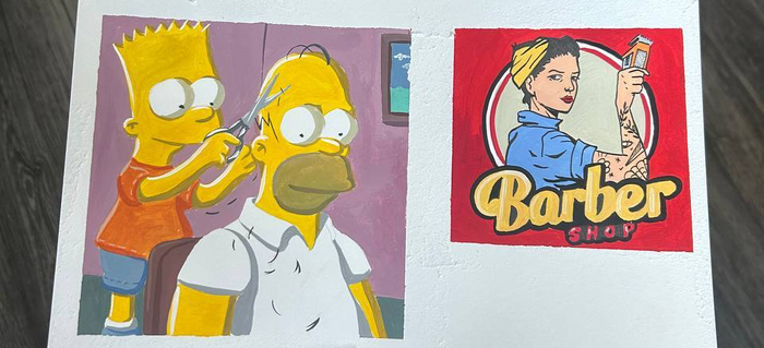 Короче. Он хотел картину в мульт стиле с узнаваемыми персами и главное условие - чтобы сюжет был в картине про барбер шоп.