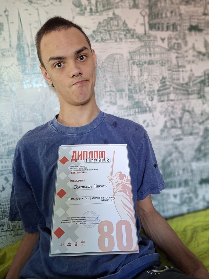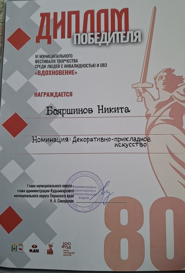 Я с радостью сообщаю о своей победе на VI Муниципальном фестивале для людей с инвалидностью и ограниченными возможностями здоровья «Вдохновение». Я стал победителем в номинации «Декоративно-прикладное творчество / Изобразительное искусство». Эта моя работа посвящена 100-летию Коми-Пермяцкого округа и является данью уважения моему педагогу.