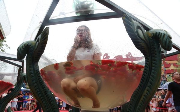 В китайской провинции Хунань прошло необычное соревнование по скоростному поеданию красного острого перца. Мужчины и даже барышня уминали чили, купаясь в огромной миске с красным перцем. Победителем стал участник, проглотивший 15 острых перцев всего за одну минуту.